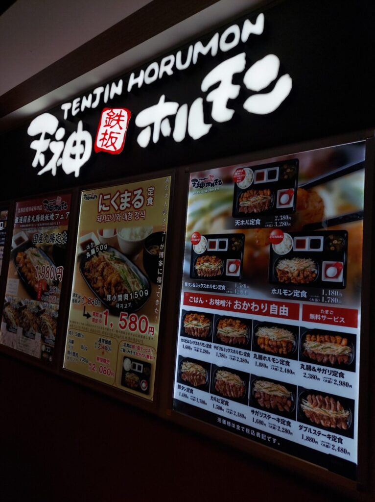 天神ホルモン:目の前の鉄板で焼くスタイル。目でも美味しいし、食べても美味しい。