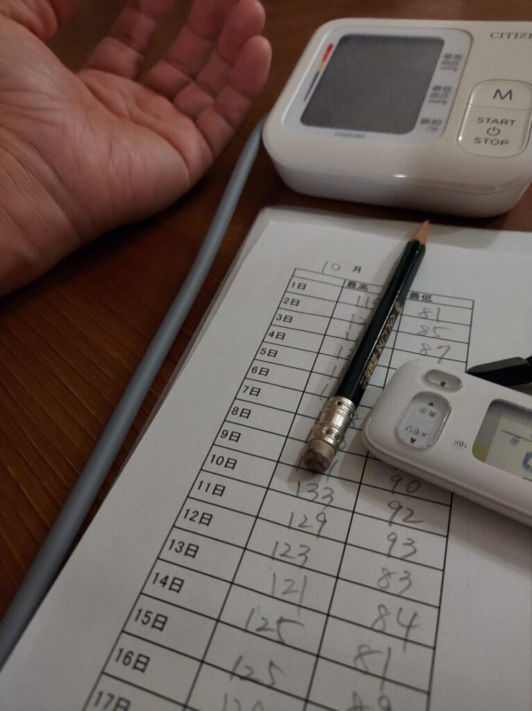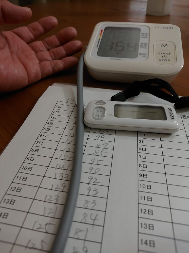 血圧計測、万歩計更新。白湯飲みながら目標確認。